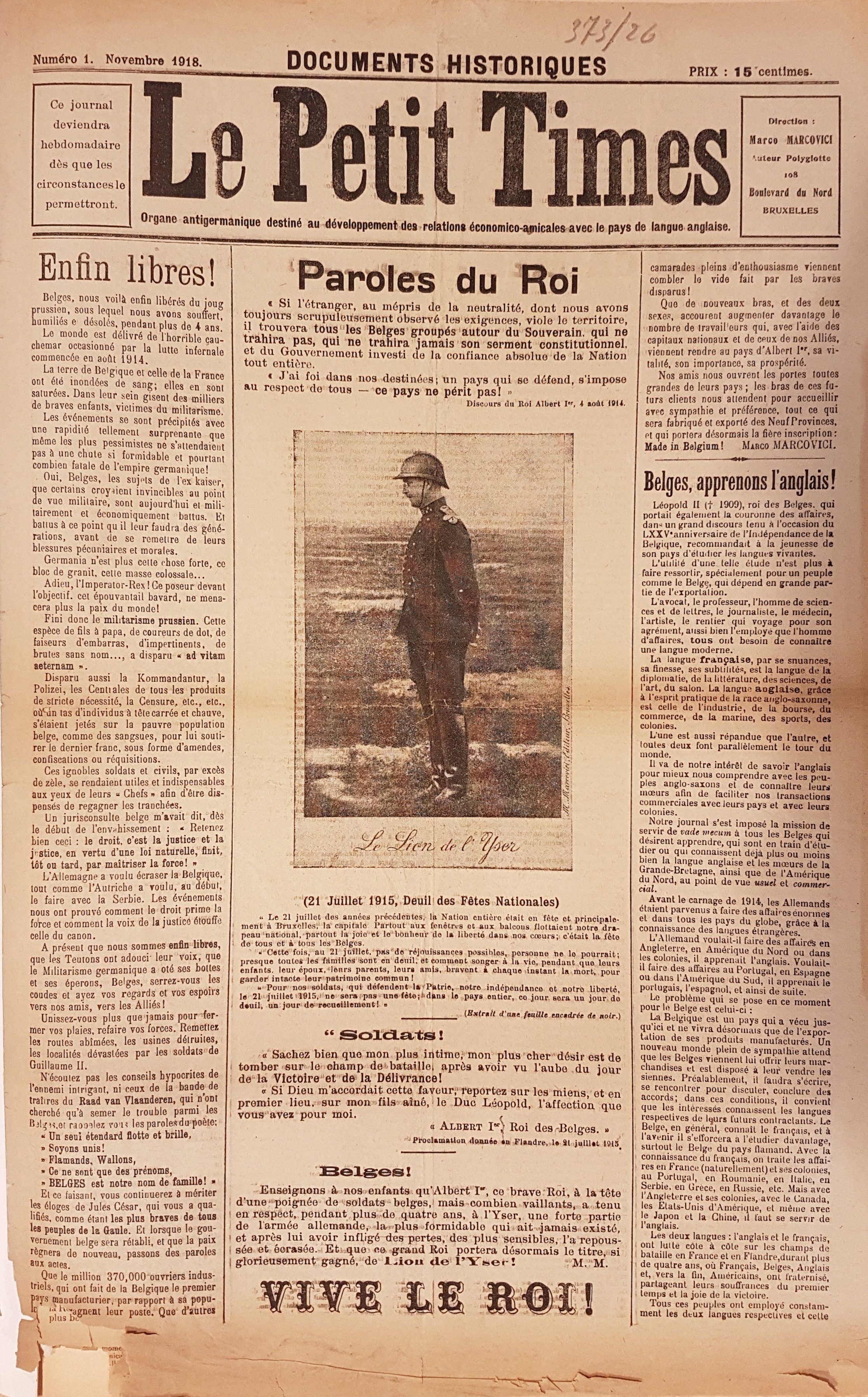 Journal créé par Marcovici, en novembre 1918, à l’époque, il était Boulevard du Nord à Bruxelles