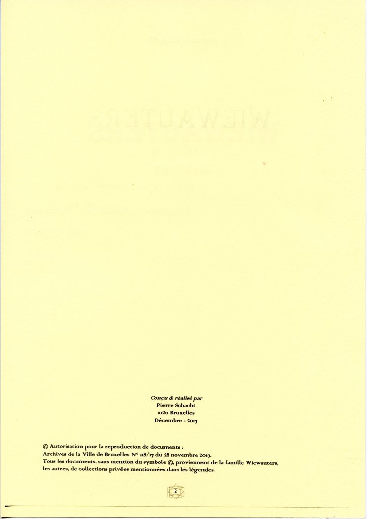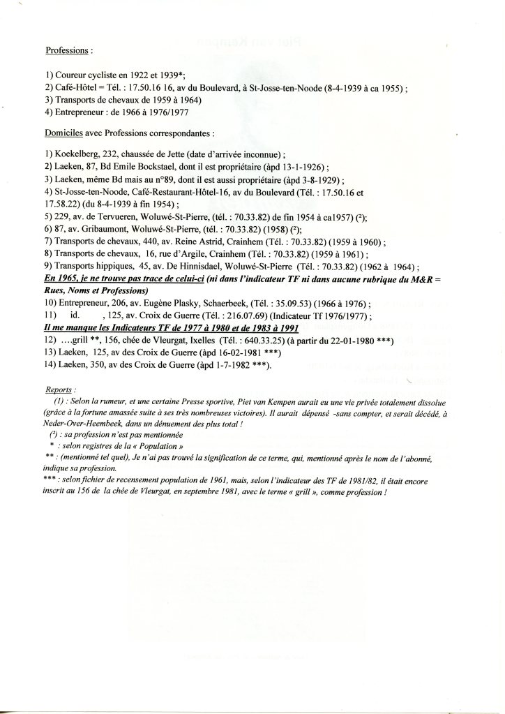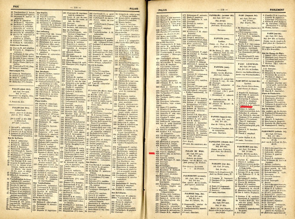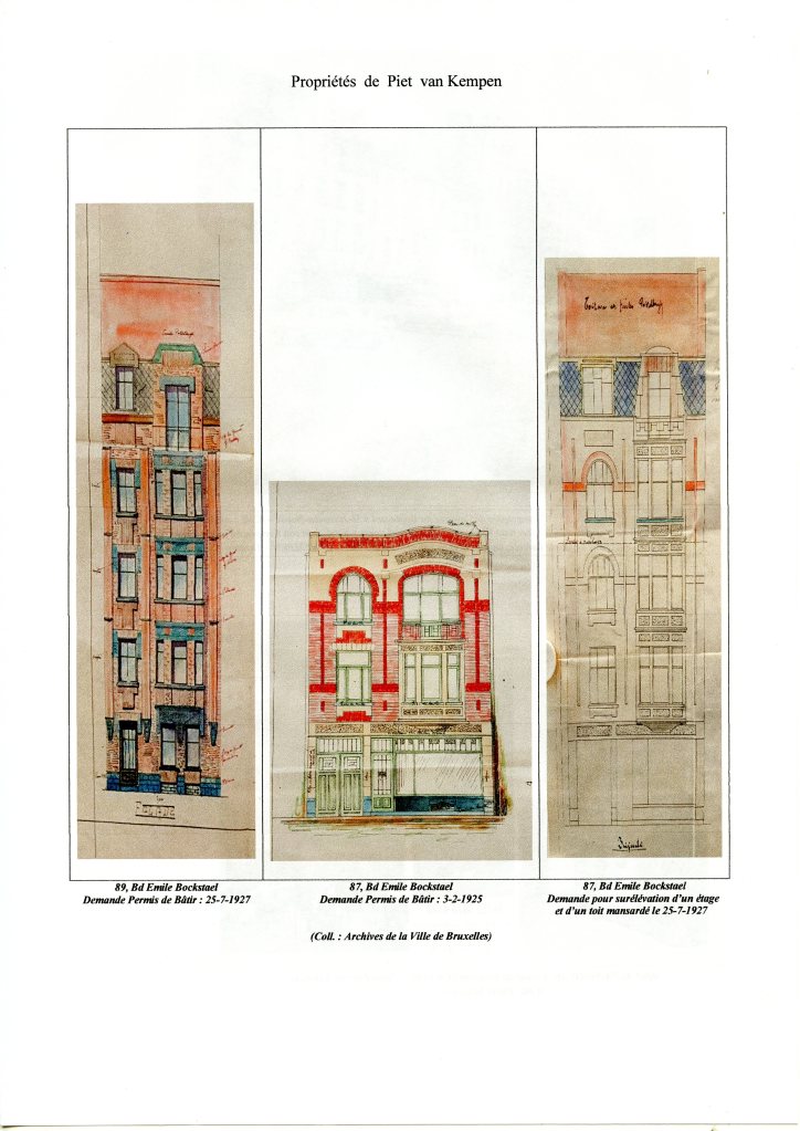 Domiciles : 1) 428, rue des Palais, depuis le 28-3-1882 au 17-3-1891 (Négociant en farines) ; 2) 423, rue des Palais, du 17-3-1891 au 13-6-1911; 2bis) Résidence secondaire : 79 (devenu 91), rue des Ailes à Schaerbeek, du 5-9-1907 au 13-6-1911 ; 3) 96, rue de Laeken, du 13-6-1911 jusqu’à son décès survenu 1 mois et 9 jours plus tard,