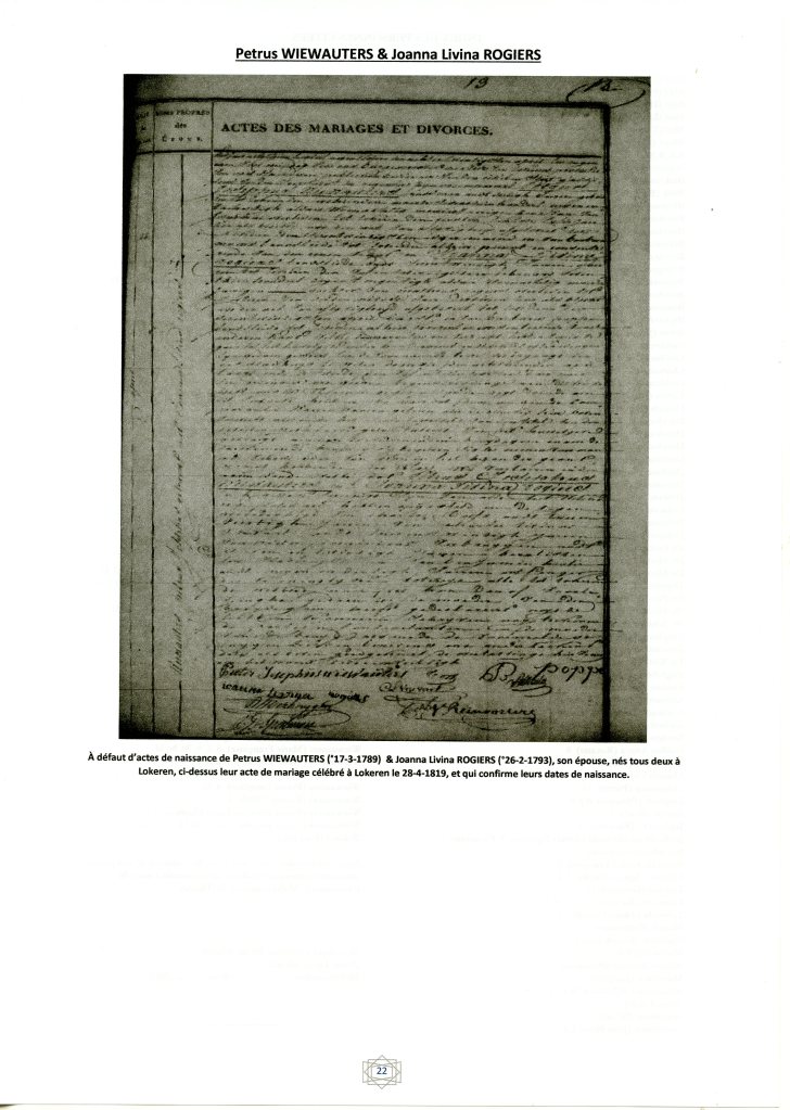 Epouse : MULS Joanna Maria Antonia °26-3-1832 à Wespelaar (*), sans profession ; qu’il épouse le 4-11-1858 à Wespelaar (*) = DCD le 22-6-1902 à Laeken, à son domicile, 423, rue des Palais (*) ;