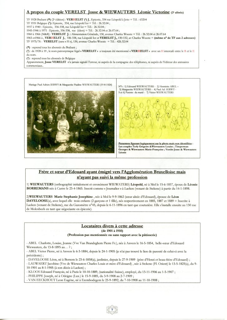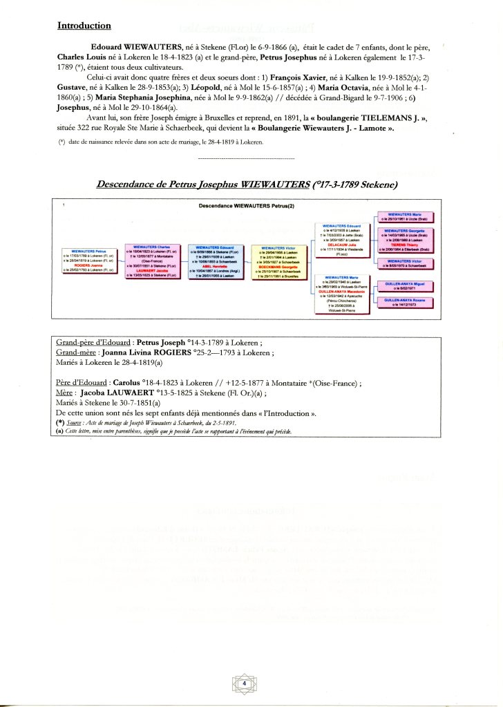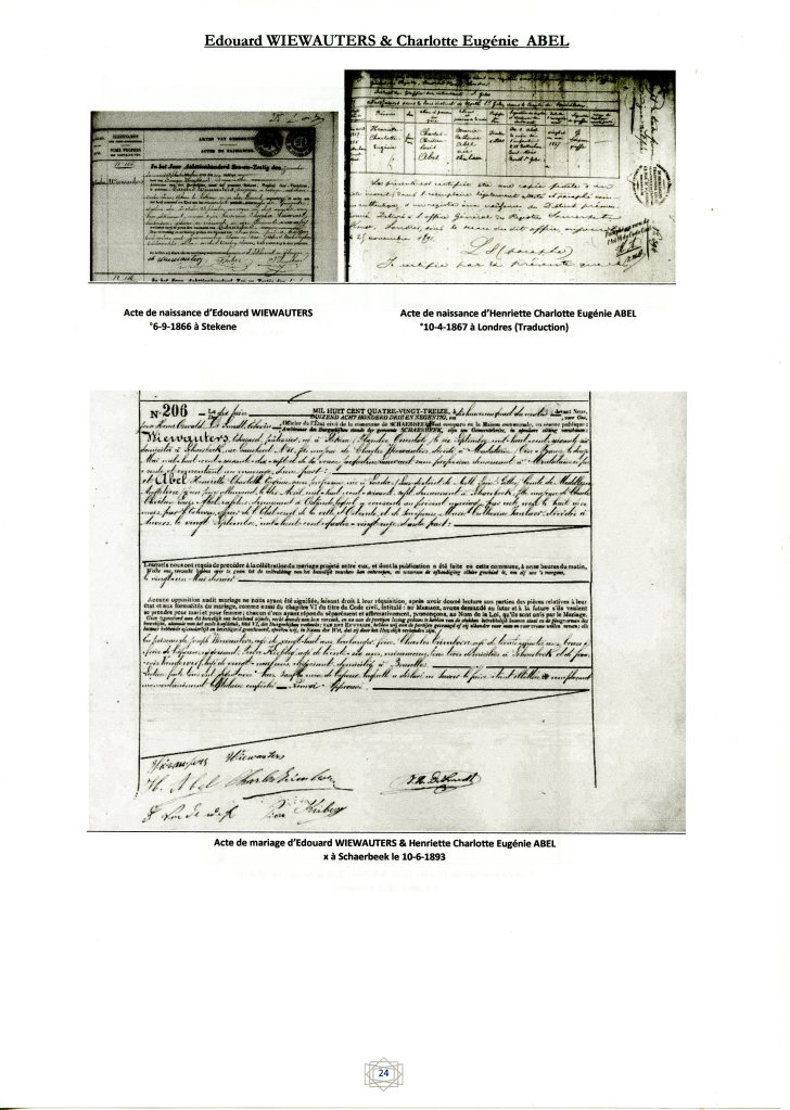 Se remarie, le 6-8-1907 à Schaerbeek avec Marie Catherine VANDENBROECK (*), née à Laeken le 7-5-1866 (*). Le ménage est inscrit à Schaerbeek, 79, rue des Ailes, depuis le 12-8-1907