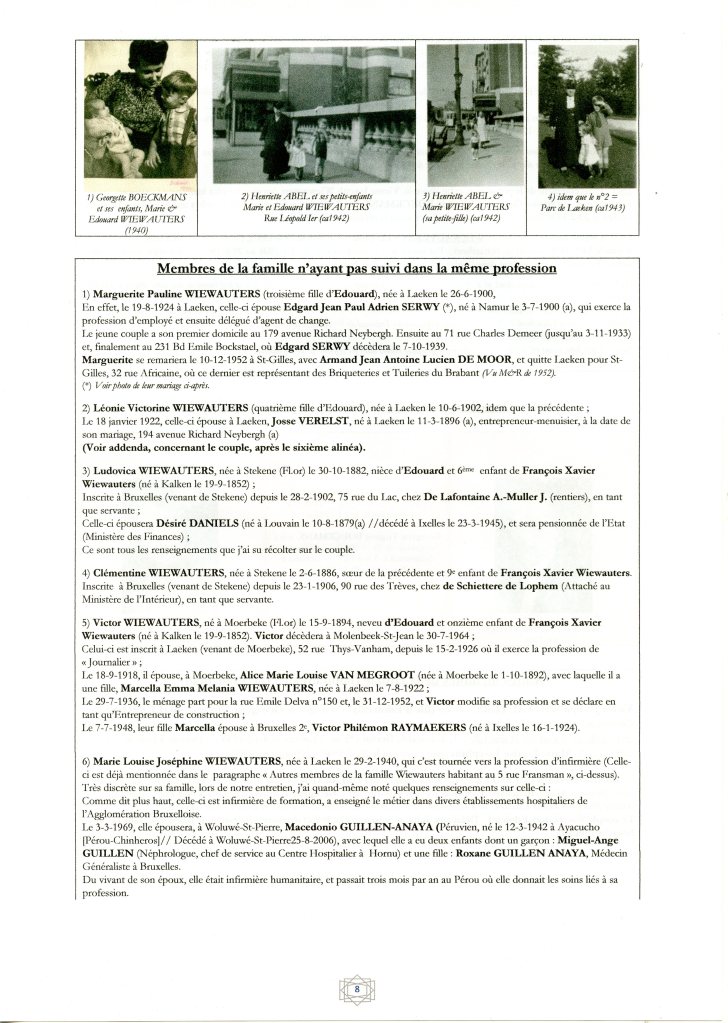 Enfants (3, tous nés à Laeken) : 1) Madeleine Prudence Jeanne °12-10-1890 (*) ; 2) Marie Emile Albert °12-8-1898 (*) et DCD à Laeken le 15-5-1899 (*) ; 3) Paul Marie Georges °20-5-1900 (*)